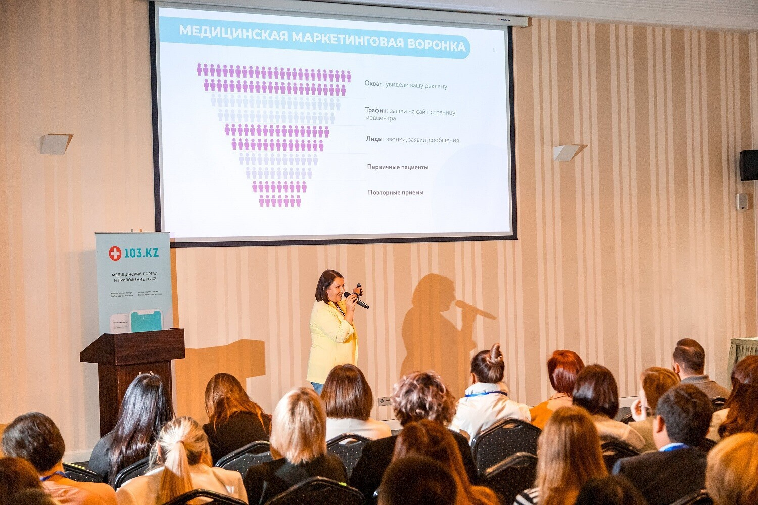 Команда 103.KZ принимает активное очное и заочное участие в профильных медицинских выставках, таких как KIHE, CADEX, «Астана Здоровье» и др. Также 103.KZ организовывает собственные онлайн и офлайн мероприятия, которые направлены на развитие медицинского бизнеса в Казахстане.