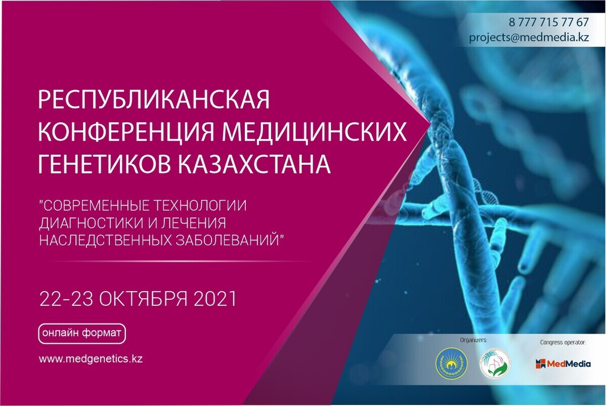 АО «Научный центр акушерства, гинекологии и перинатологии», РОО «Ассоциация медицинских генетиков» приглашают 22–23 октября 2021 года на Республиканскую онлайн-конференцию медицинских генетиков Казахстана «Современные технологии диагностики и лечения наследственных заболеваний».