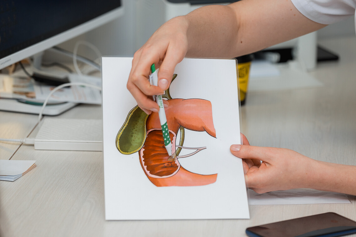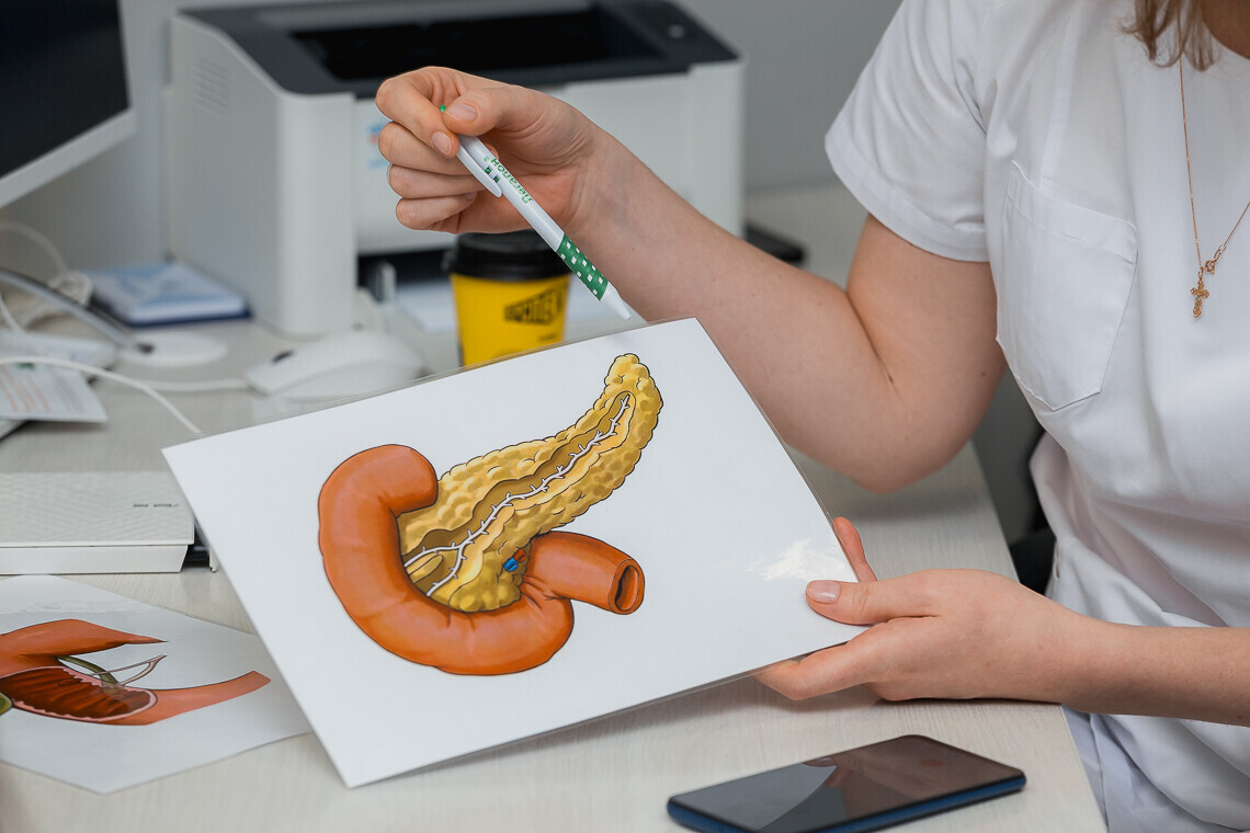 Эти ферменты попадают в двенадцатиперстную кишку через протоки, которые открываются вместе с общим желчным протоком. Ферменты из секрета смешиваются с желчными кислотами, активируются — и начинается процесс пищеварения. Протеаза расщепляет белки, липаза — жиры, а амилаза — углеводы.