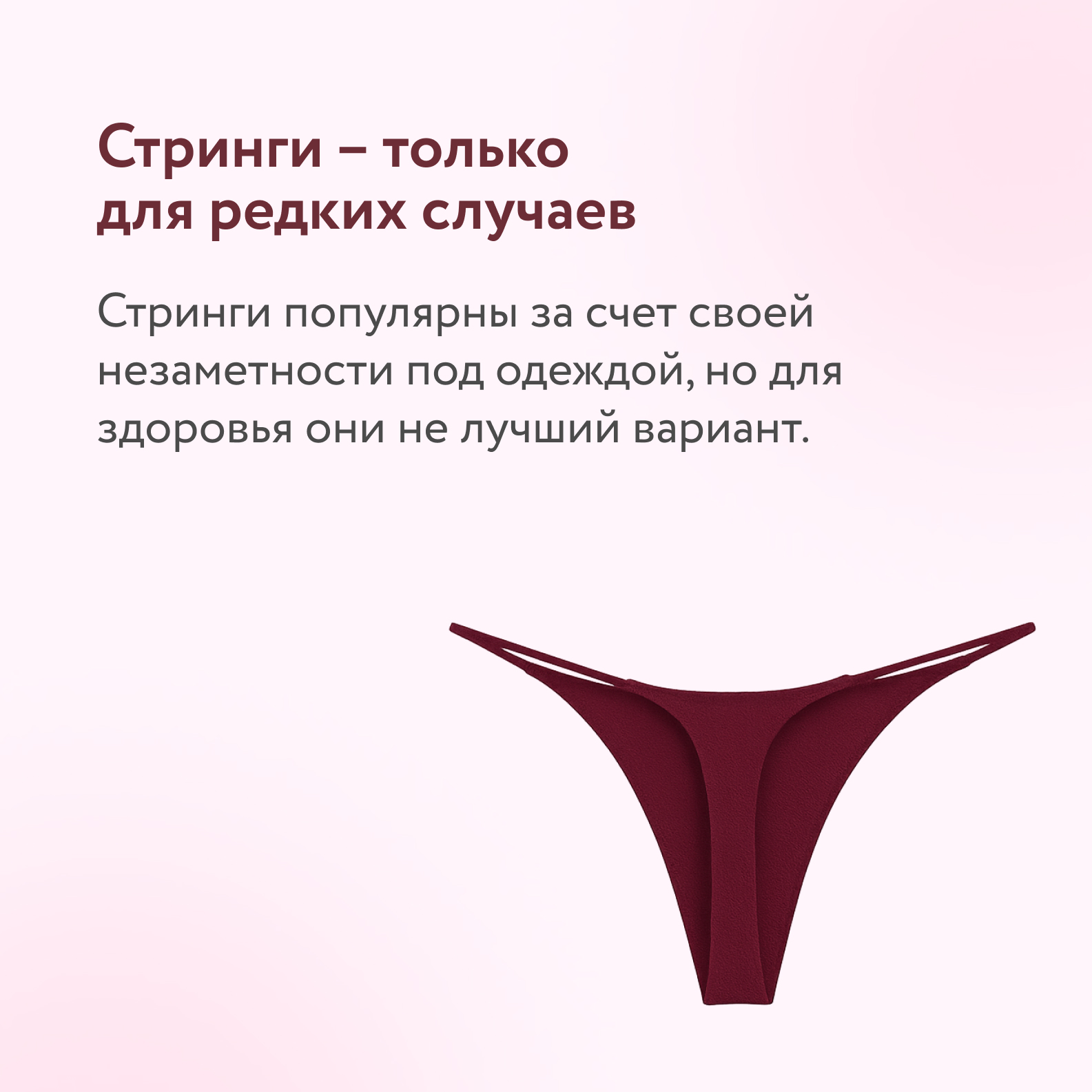 «Стринги – не самый подходящий фасон, так как основная защитная функция белья выполняется не полностью. Их можно носить, но не на постоянной основе и только из натуральных тканей».