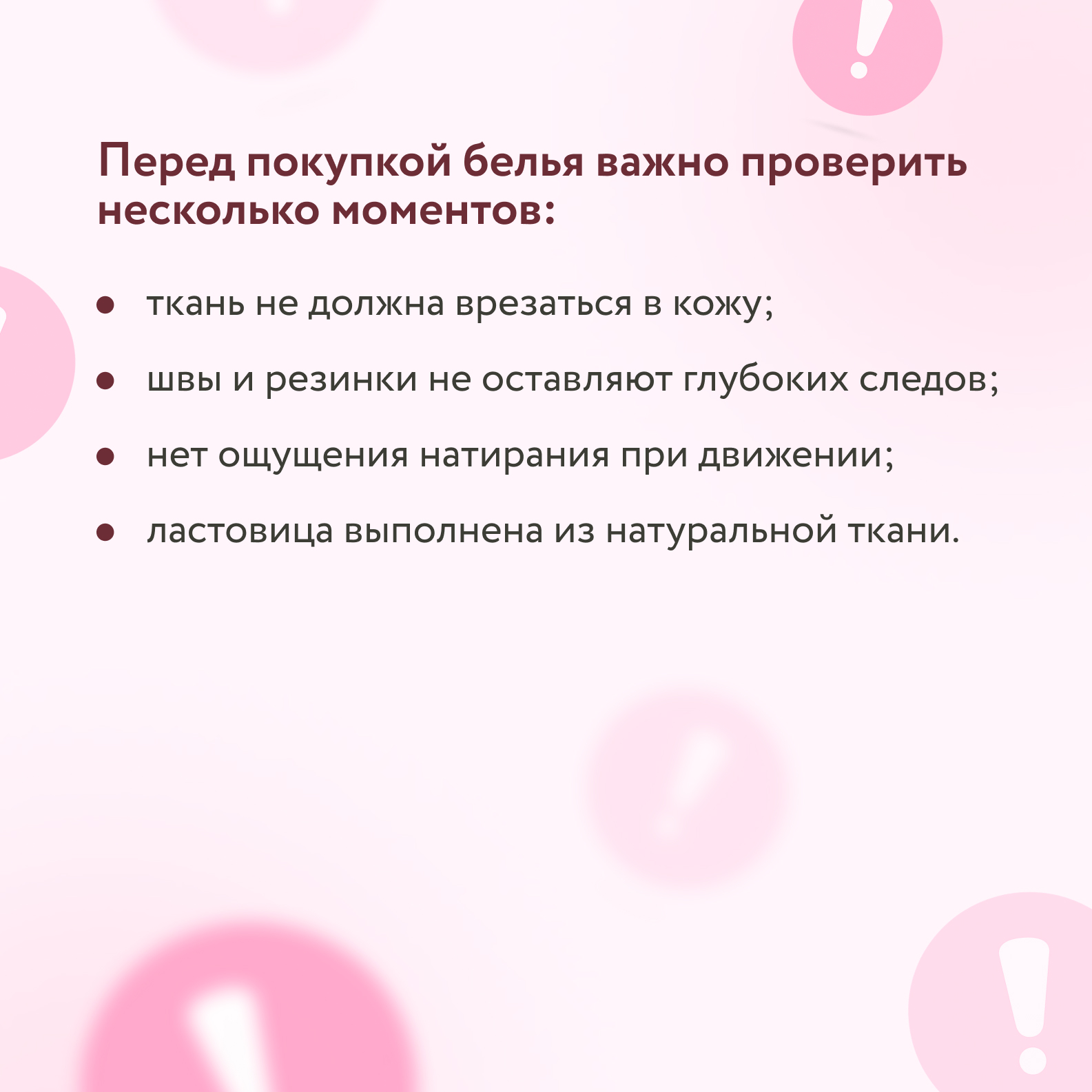 «Признаки неподходящего белья: слишком свободное или, наоборот, маленькое; состав – только синтетика или полиэстер; низкое качество материала; ластовица не из натуральных тканей».