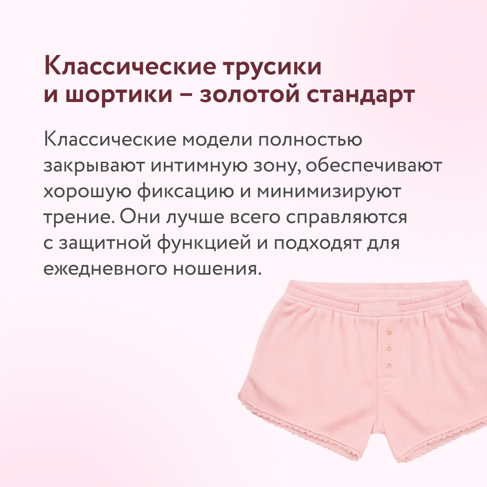 Шортики или классические трусики лучше всего выполняют защитную функцию. Модели вроде стрингов или бразилиана можно оставить для особых случаев. - Размер имеет значение
