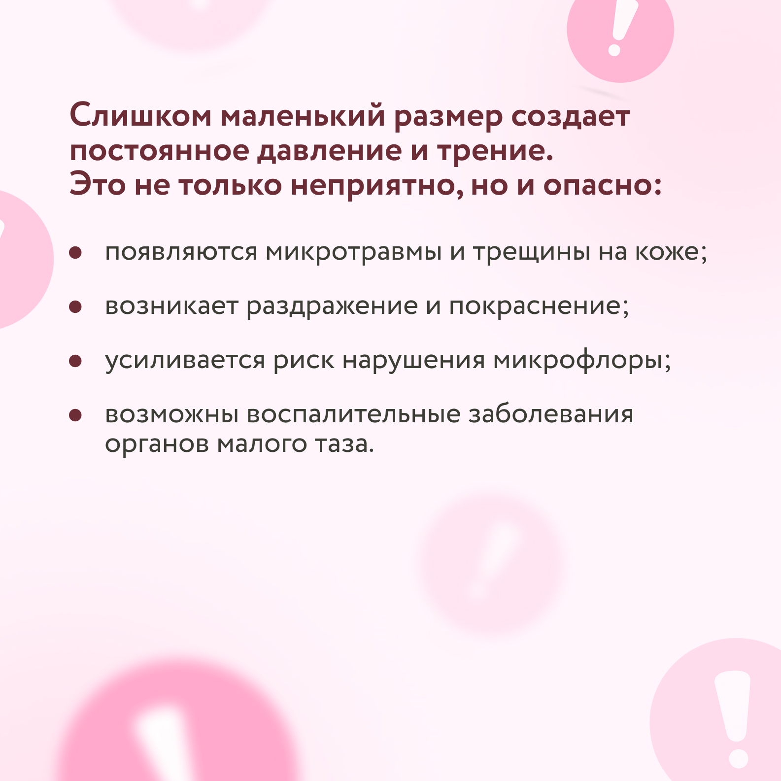 На первый взгляд, просторные модели кажутся более удобными, но слишком свободное белье тоже несет риски. Оно не обеспечивает необходимой фиксации и не выполняет защитную функцию. В результате увеличивается контакт кожи с внешней средой, что повышает риск заноса инфекции и раздражения.