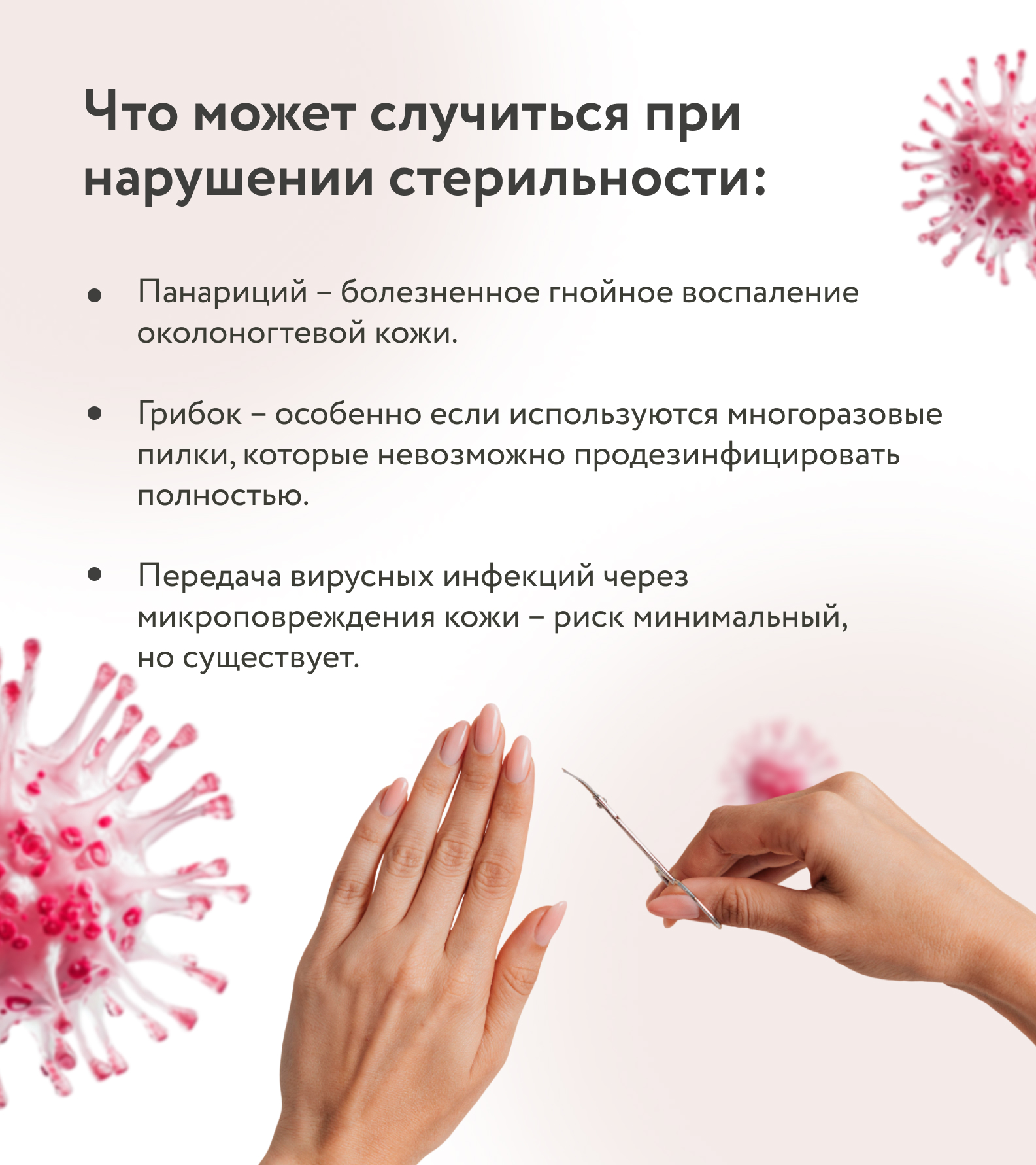 Не менее рискованны грибковые инфекции. Инструменты, особенно многоразовые пилки, могут переносить споры, а дезинфекция их не убивает: