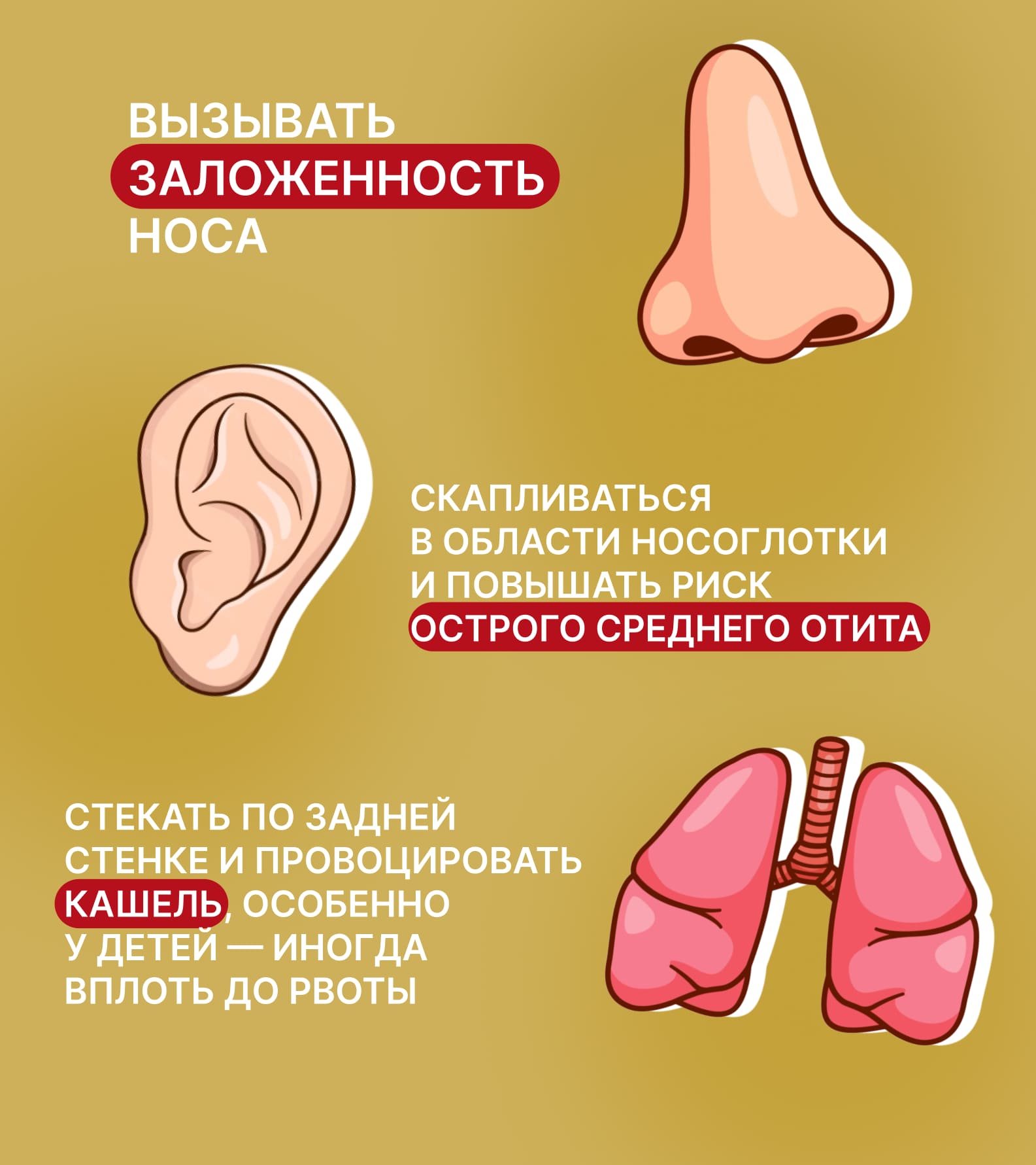 «Эта слизь может оставаться и давать заложенность носа, может оставаться в области носоглотки и способствовать формированию острого среднего отита. У детей из-за стекания слизи иногда возникает сильный кашель, вплоть до рвоты», – говорит врач.