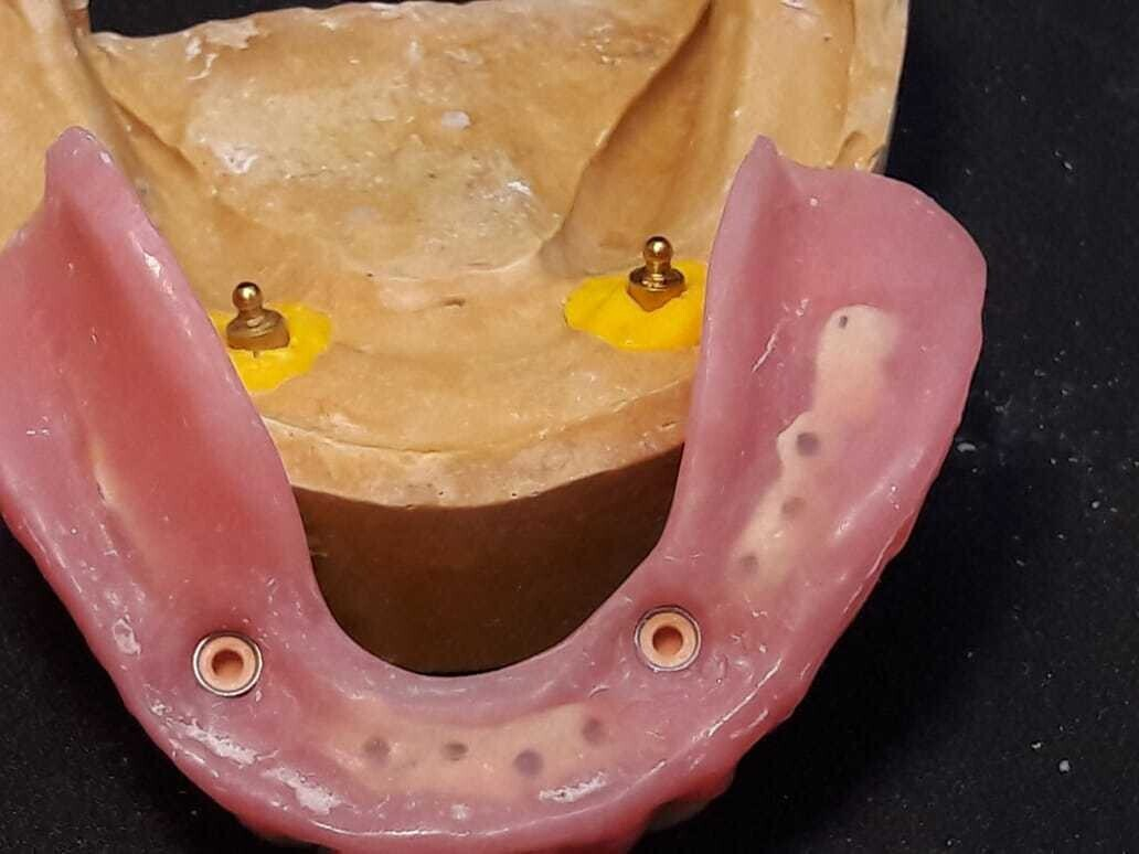 Пациенту на полную беззубую челюсть устанавливается 2 имплантата. После приживления на них ставятся бол-абатменты. Далее снимается слепок, и зубной техник изготавливает съемный протез с местами крепления для бол-абатментов.