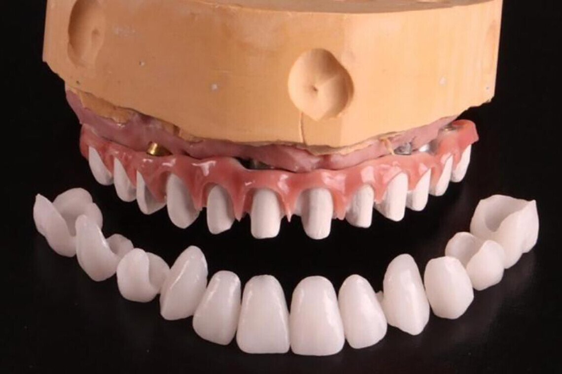 Базис из BioHPP изготавливается цельным, а вот коронки — каждая отдельно.